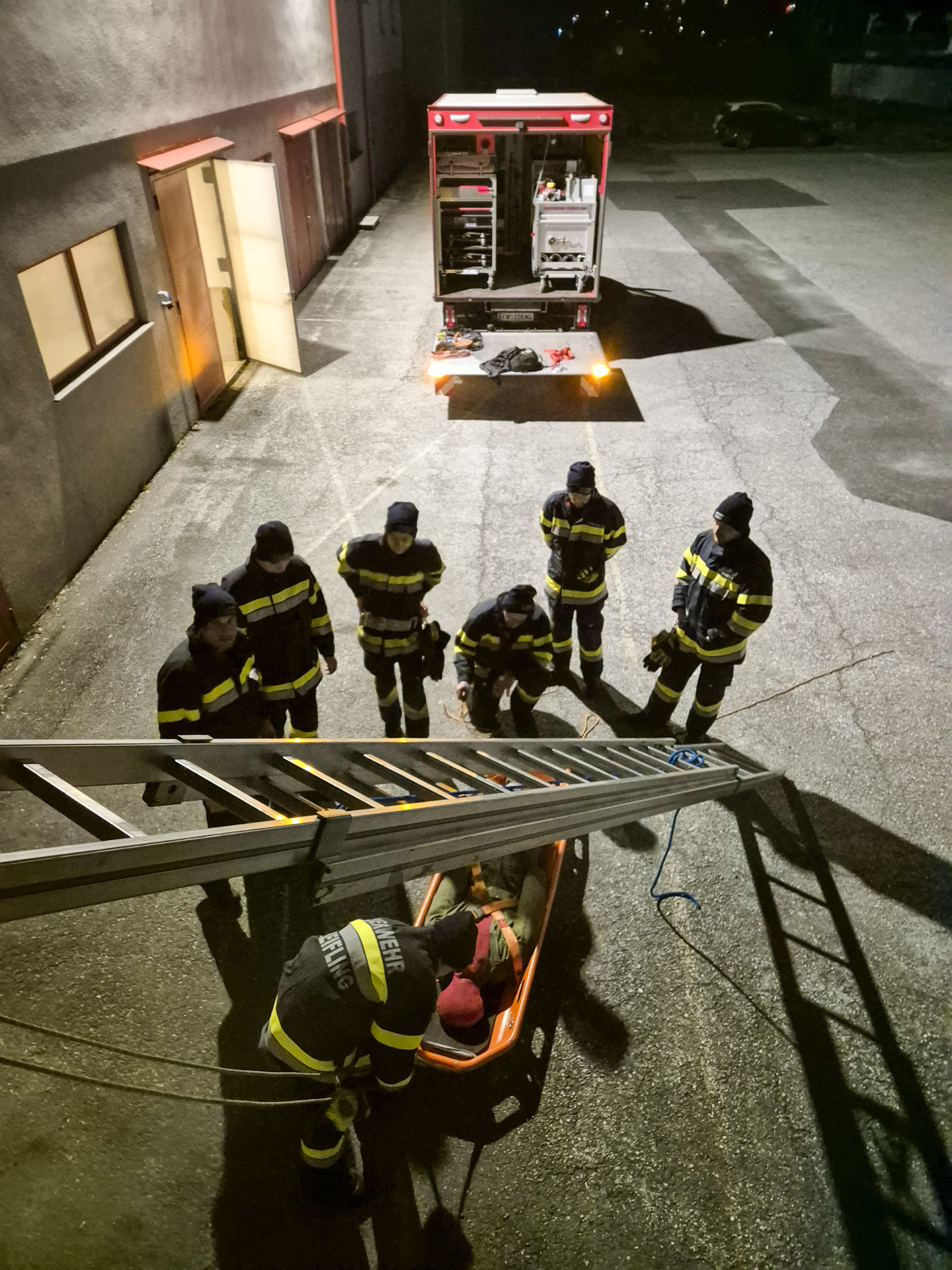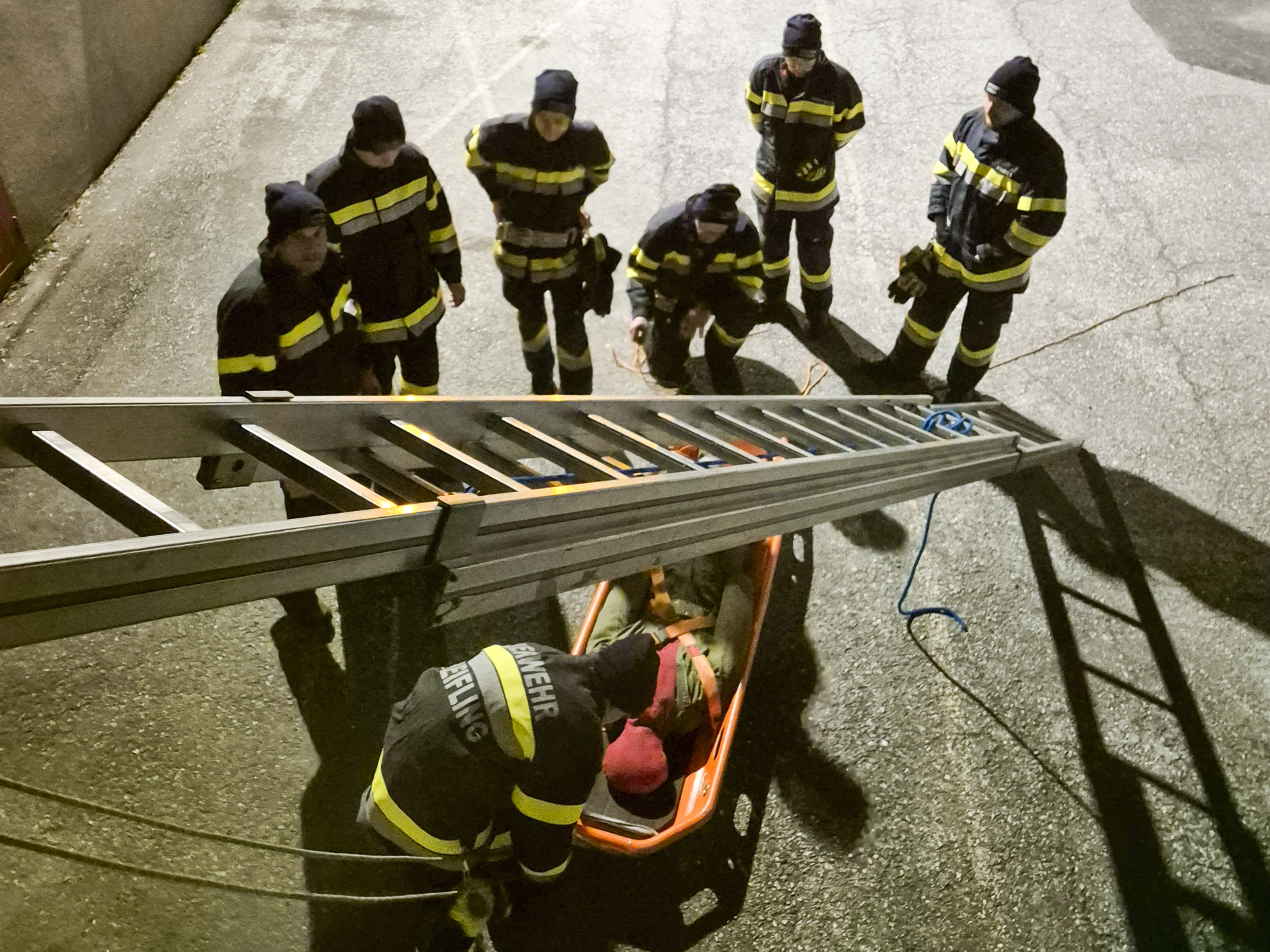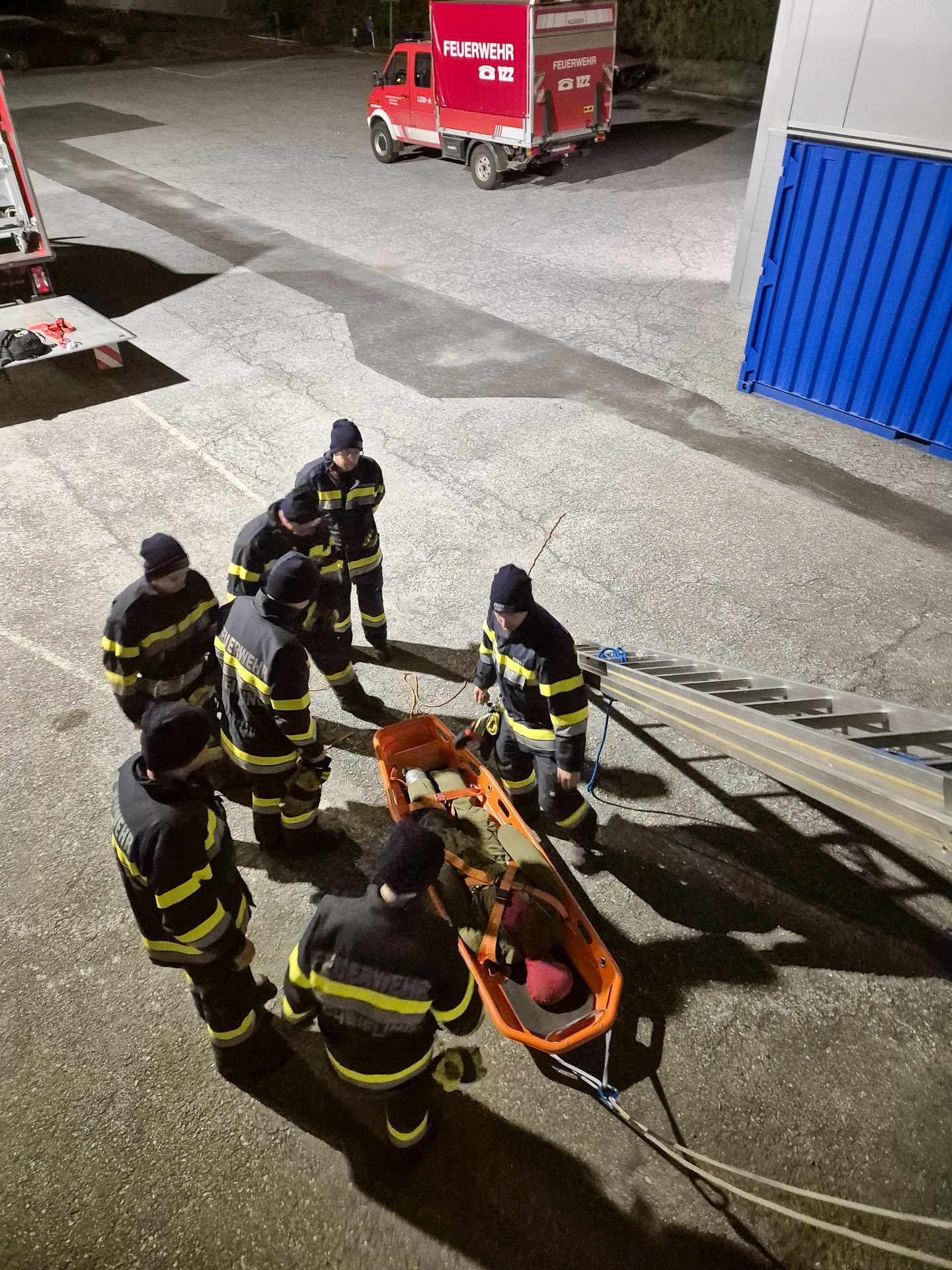 Grundlegende Arbeiten und der sichere Umgang mit der Seiltechnik geschult. Übungsannahme war das Retten einer Person mittels Korbtrage über die dreiteilige Schiebeleiter.